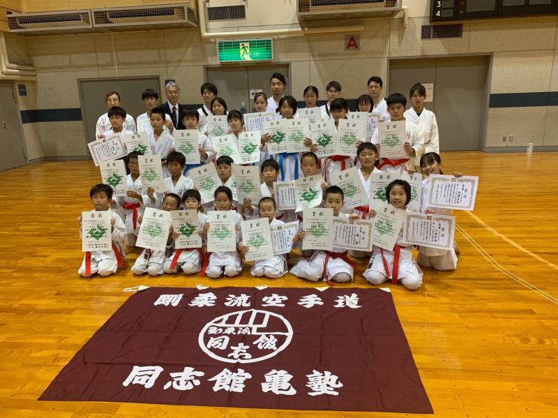 大会模様 (全国少年少女、亀岡市空手道選手権大会、伊都地方少年空手道大会) 令和4年度はコロナ禍の中でも本格的に大会が再開となりました。 7月4日の亀岡市大会は、同志館亀塾が発足し、亀岡市連盟加盟後の初の大会となりました。個人戦の形、組手ともに優勝や準優勝、多くの入賞者があり、試合を目指して練習した生徒達は力が発揮できました。また、本部からの応援で出場した小学生低学年の団体組手はみごと優勝!亀塾と本部の保護者が一体となって応援しました。今後も本部、スイトピア、宇治、亀塾と交流や稽古を重ねて、同志館として盛り上がっていきたいと思います。 7月24日の伊都地方大会は初参戦となりました。団体形は男女ともに3位を獲得し、メンバーが必死で取り組んだ成果が出て、笑顔の入賞でした。団体組手は小学生女子が健闘し3位。あと少しで決勝を逃しましたが、保護者の応援には熱が入り、今後に期待出来る結果となりました。 全国少年少女大会に出場した3名は全国のレベルと雰囲気を味わえて良い経験となりました。