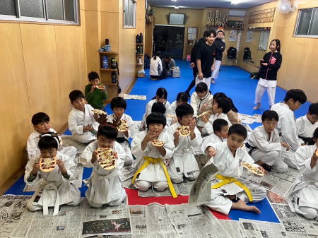 練習は約50名でところ狭しとなり、基本、形の発表、さわり組手など高校生の手も借りて、しっかりと汗を流しました。お待ちかねのタコせんべいは女子が中心にソース、マヨネーズ、鰹節、天かすと順に乗せて皆に配ってくれ、おかわり、おかわりと、5枚も食べる食欲旺盛な子もいて、大喜び!