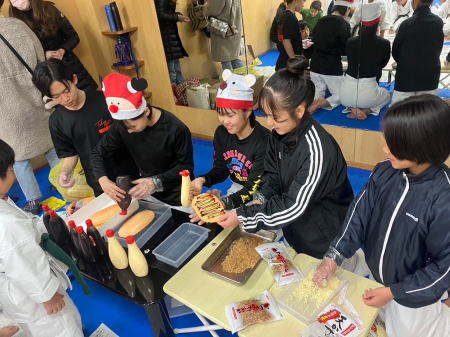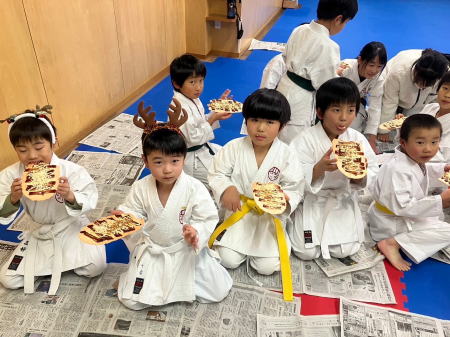 2023年12月22日、壬生道場稽古納めの風景です。たこせんべいを作って食べ、抽選会で盛り上がりました!