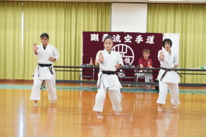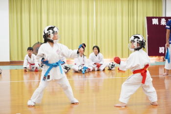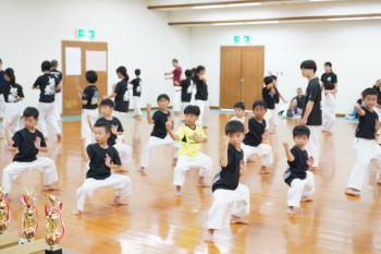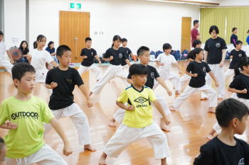 基本と体力作りの練習は自分との戦い。暑さに負けず一生懸命に突き、蹴り、受け、立ち方を正確に頑張っていました。中学生の形発表は女子のパイクー対男子のサンセール。小学生は初めて見る形に驚きと、あこがれの目でくいいるように見学し、勝利は男子チームに決まりました!
