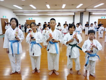 午後からの組手試合は団体戦。中学生がそれぞれチームを率いて監督となり、作戦を立てて練習し、各チームが工夫を凝らしました。中学生の監督姿はとても立派で、小学生は仲間の応援を受けて力を発揮することができました。決勝はAチーム対Dチームとなり、新ルールをうまく利用して、5人の団結の結果、Dチームが優勝となりました。