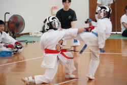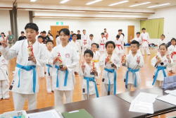 午後からは組手練習と試合は団体戦。今年は小森先生が返し技の取得をわかりやすく工夫して指導しました。初めての練習方法も高校生と指導者が丁寧に教えて、みんな一生懸命に練習しました。団体組手は中学生が監督を務めて、小学生を盛り立て、選手は仲間の応援を受けてしっかり力を発揮することができました。チーム団結の結果、Aチームが優勝となり、全員がトロフィーをもらえました。。