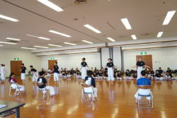 基本と体力作りの練習は暑さに負けそうな小学生もいましたが、突き、蹴り、受け、立ち方を正確に体で覚えるた目頑張りぬきました!中学生の形発表は今年は5チームになり、1か月間の練習の成果を発揮しました。小学生は全中出場チームの形のスピードと一体感には驚きと、あこがれの目で見学していました。