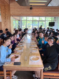 本部道場、スイトピア強化生、アクオン強化生、小倉道場、亀塾の参加となり、総勢60名で熱気いっぱいの楽しい練習会となりました。観光バスではビー玉当てクイズやおしゃべりでにぎわい、昼食のカレーライスは一人も残さずに食べました。恒例のビーチボール遊びはボールを増やして皆で楽しみました。